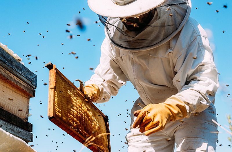 Ein Imker kümmert sich um Bienen. Die Bienen sammeln Nektar aus Blumen und machen daraus Honig. Bienen sind sehr wichtig für die Natur.