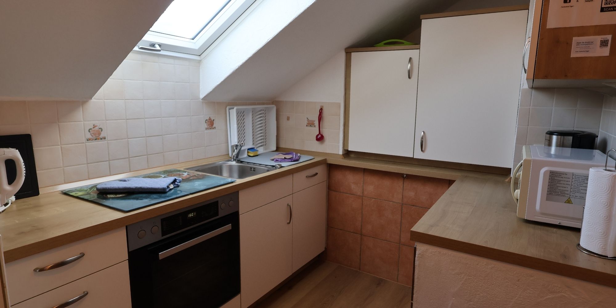 Die voll ausgestattete Wohnküche mit Backofen, Geschirrspüler, Filterkaffeemaschine & Wasserkocher lässt keine Wünsche offen.